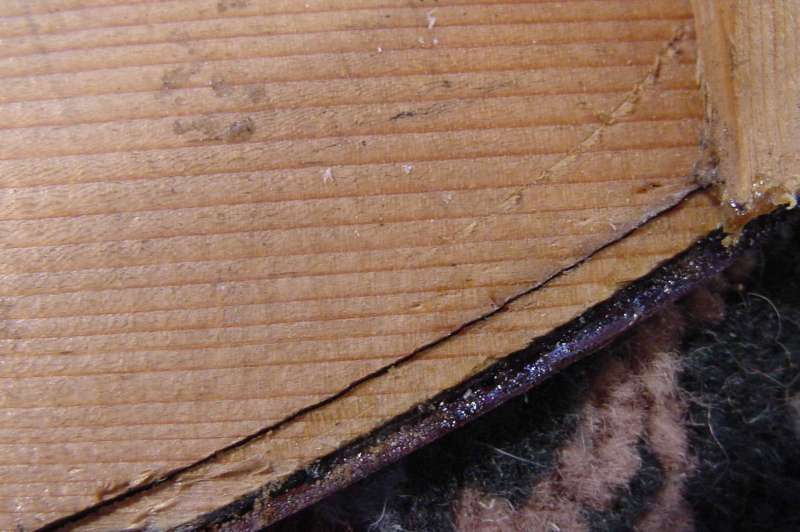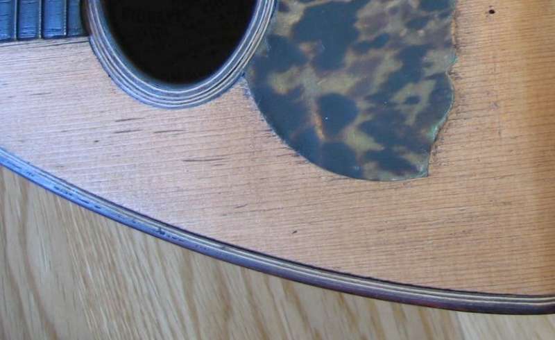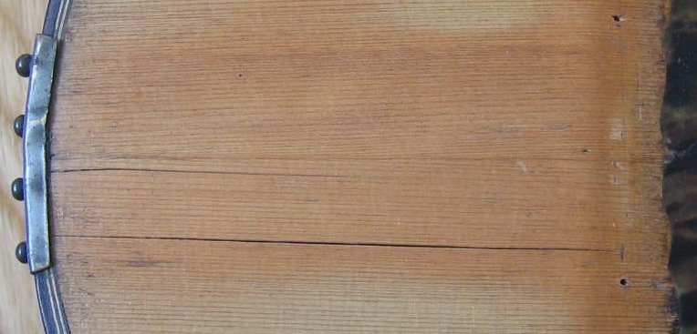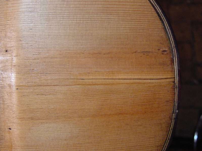 The channel into which the purfling around the edges of the instrument is inlaid had been cut too deep. As the soundboard had further dried and shrunk over the years it has cracked along the inside of the purfling channel. The following photographs show the crack running along the inside of the purfling channel: