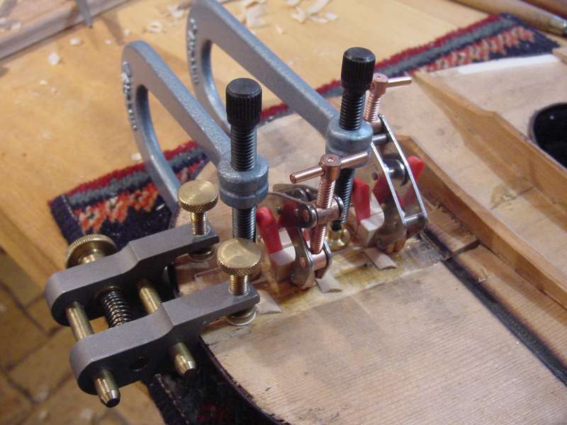 First of all small spruce temporary clamping blocks are fitted and glued to the inside of the soundboard, either side of the crack. Temporary studs have also been glued over the centre joint, to ensure that is not compromised during the course of the repair. The large grey clamp at the end of the plate is an end crack clamp, it is made of titanium for lightness. It has four screws that clamp to the soundboard on either side - both to fix it firmly to the plate, and to help level the crack. The large brass knob on its side pulls the two sides of the crack together. The chromed/coppered miniature parallel clamps are acting on the temporary blocks to pull the crack together. The red wedges are preventing the crack from twisting as it is clamped - ensuring that it comes together in parallel, these are very important to the success of this technique. The blue aluminium repair clamps are clamping over the crack, onto strips of clear perspex, ensuring that the crack is level. This repair technique was developed relatively recently, and is a big improvement over the old technique of using long stretcher clamps - though these can still prove useful at times, normally in conjunction with this technique.