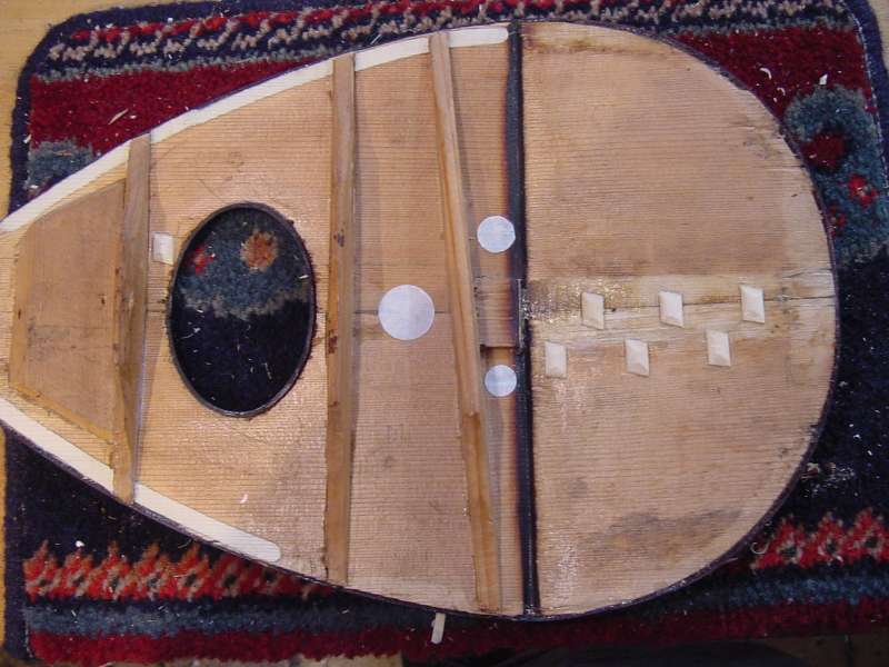The following picture shows the inside of the soundboard with all the underedging fitted and trimmed up, and all the cracks glued and cleated. The small white discs are made of handmade Japanese Washi paper, I use these as a preventative measure where I can otherwise see some possibility of future problems. Handmade Washi paper contains long fibres, making it very strong, yet very light. The spruce cleats are made to be as small and light as possible while fulfilling their role in preventing the cracks from reopening, the Washi paper would be insufficient for use in these areas.
