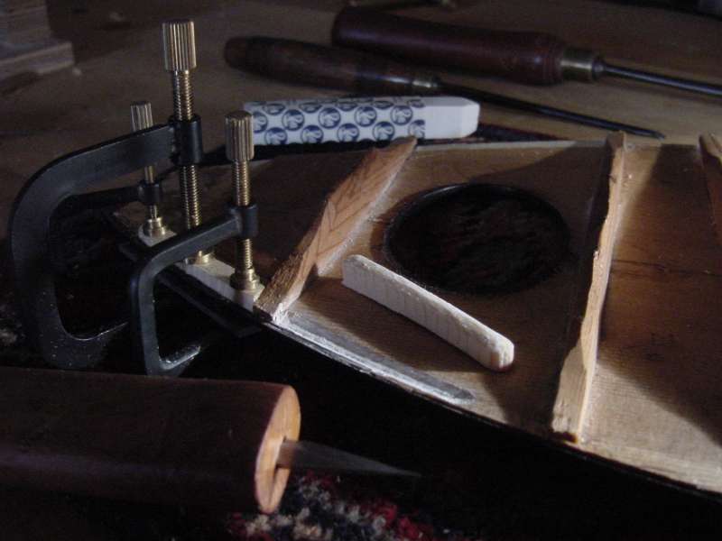 New spruce is fitted into the soundboard, along the length of the crack. In order for this repair to be strong enough to support the soundboard with the instrument under tension it is important that the new wood fits perfectly. In order to ensure that this is so, it is chalk fitted. The area that it is being fitted to is covered with a thin layer of soft chalk, and the new wood is pressed against it. The soft chalk sticks to highpoints on the new wood, which are then very carefully pared away with a razor sharp luthier's knife. This is repeated until the new wood is covered in chalk (and therefore fits perfectly), when it can then be glued into place. Once the glue has set the new wood is trimmed flush with the soundboard.